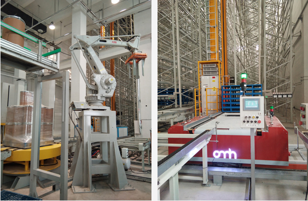 From the end of the production line of the production workshop, the finished product is automatically transported from the laser guide AGV forklift truck to the 3D warehouse to complete the storage, and the automatic storage of the empty bucket and the selection of the finished product are completed by the manipulator and the telescopic belt machine. The whole pallet loading is completed by AGV. The project is consisted of box conveying system, robot palletizing system, in and out pallet conveying system, shelf system, stacker system, pallet, WCS electrical control system, network communication system, etc. This stereo warehouse meets GMP/FDA certification qualifications.