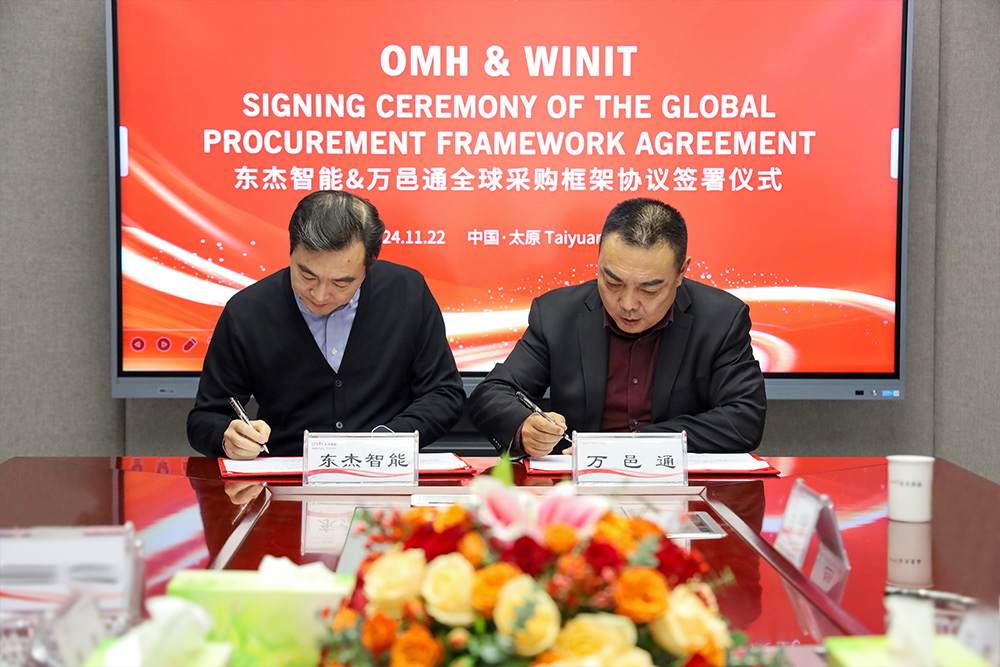 2024年11月22日,東杰智能&萬邑通全球采購框架協議簽署儀式在東杰智能總部成功舉行,合同總金額近7億元。儀式由東杰智能副總裁郭強忠主持,出席儀式的有:萬邑通董事長兼CEO陳宏偉、信息總經理徐國才,東杰智能董事長婁剛、總裁王振國、董事長助理陳晨、財務總監(jiān)張路、副總裁劉鵬。此次協議的簽署,標志著雙方在全球物流領域的合作邁向新高度。